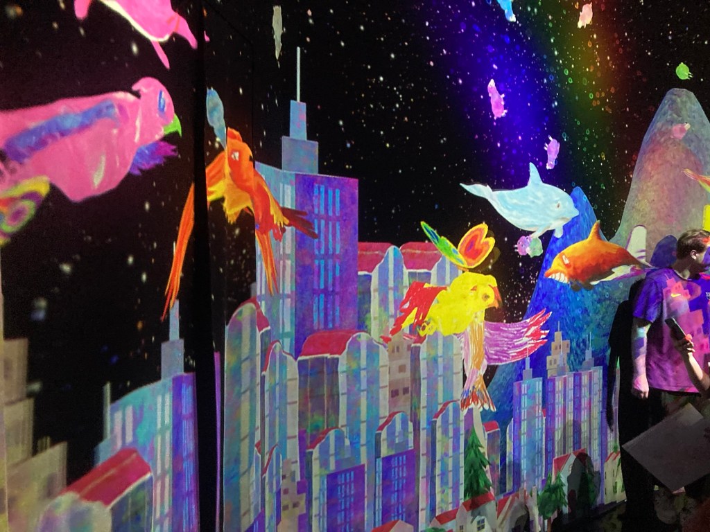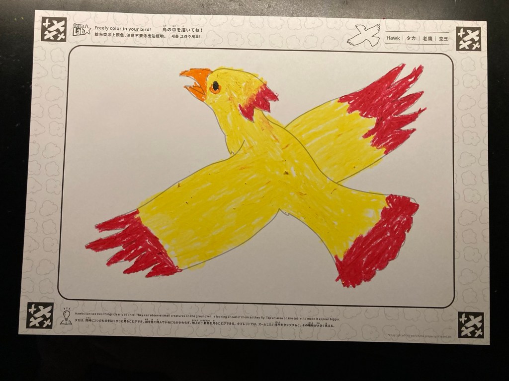 In one room Xavier coloured in a bird and then it was scanned in and flew around the room. He could even control its flight using an app on my phone. Since he was using my phone I couldn’t get a picture of this, but here is the bird he coloured and a scene on the wall later with other people’s animals.