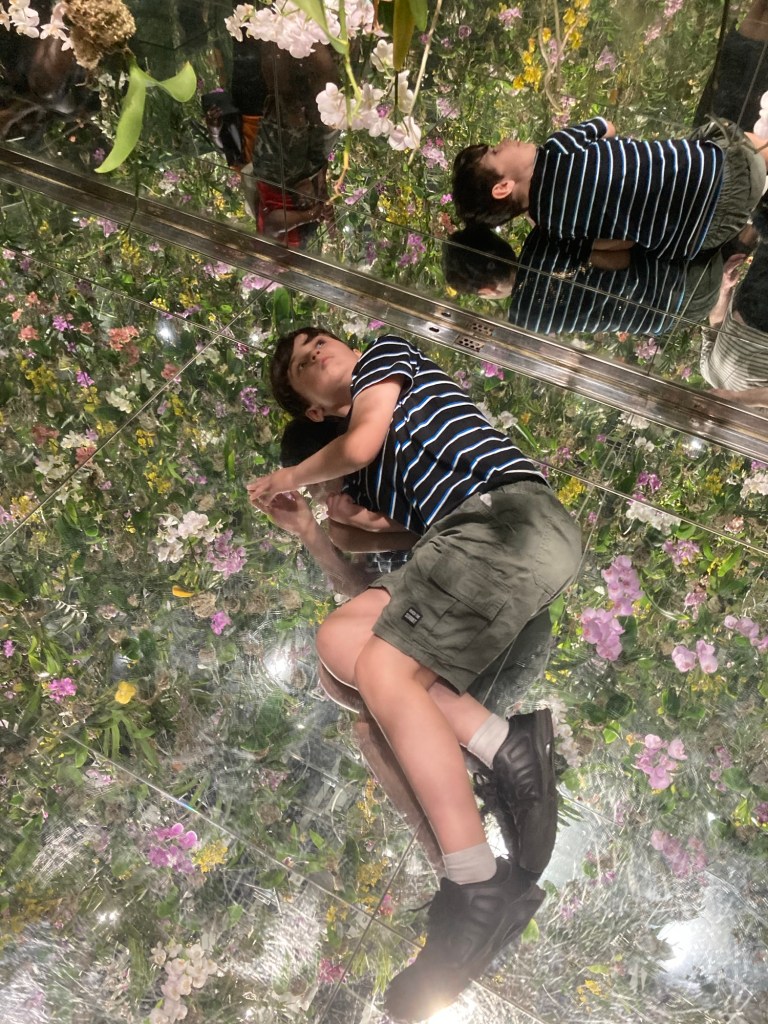 One of the artworks was a room with walls and floor entirely mirrors with orchids suspended from the ceiling on wires almost to the floor. If you moved close to them the wires would retract upwards so you could walk under them.